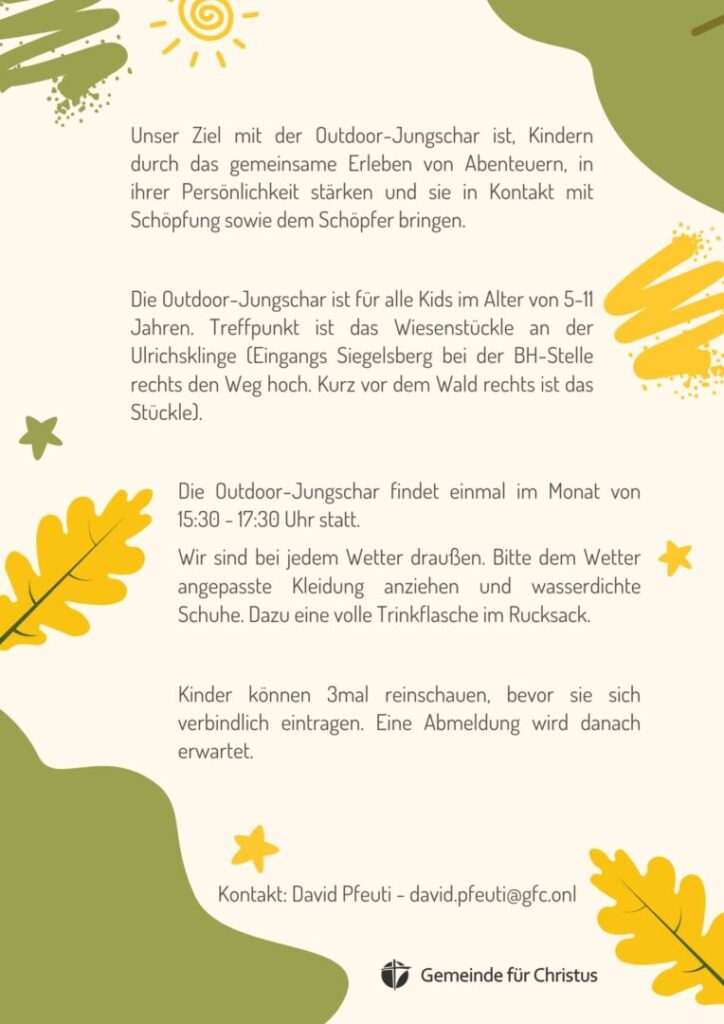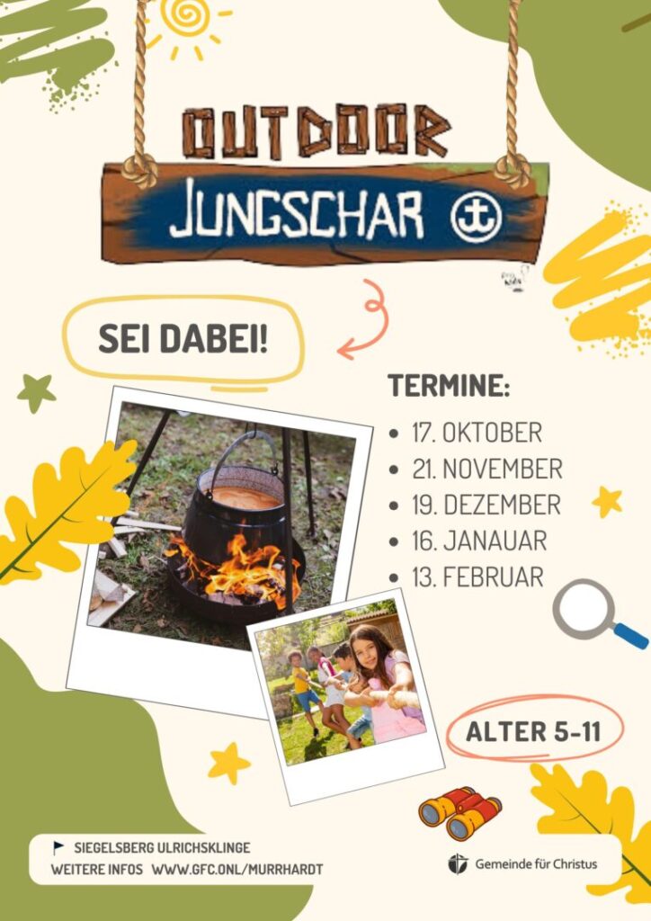 Die Outdoor-Jungschar ist für alle Kids im Alter von 5-11 Jahren offen. Treffpunkt ist das Wiesenstückle an der Ulrichsklinge (Eingangs Siegelsberg bei der Bushaltestelle, rechts den Weg hoch. Kurz vor dem Wald rechts, ist das Stückle).