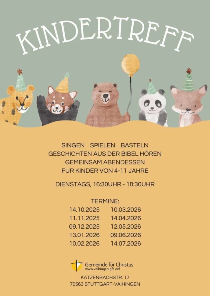 Dienstags von 16:30-18:30 Uhr. Wir singen, hören biblische Geschichten, spielen Spiele und schließen mit einem gemeinsamen Abendessen ab. Termine: s. Flyer.